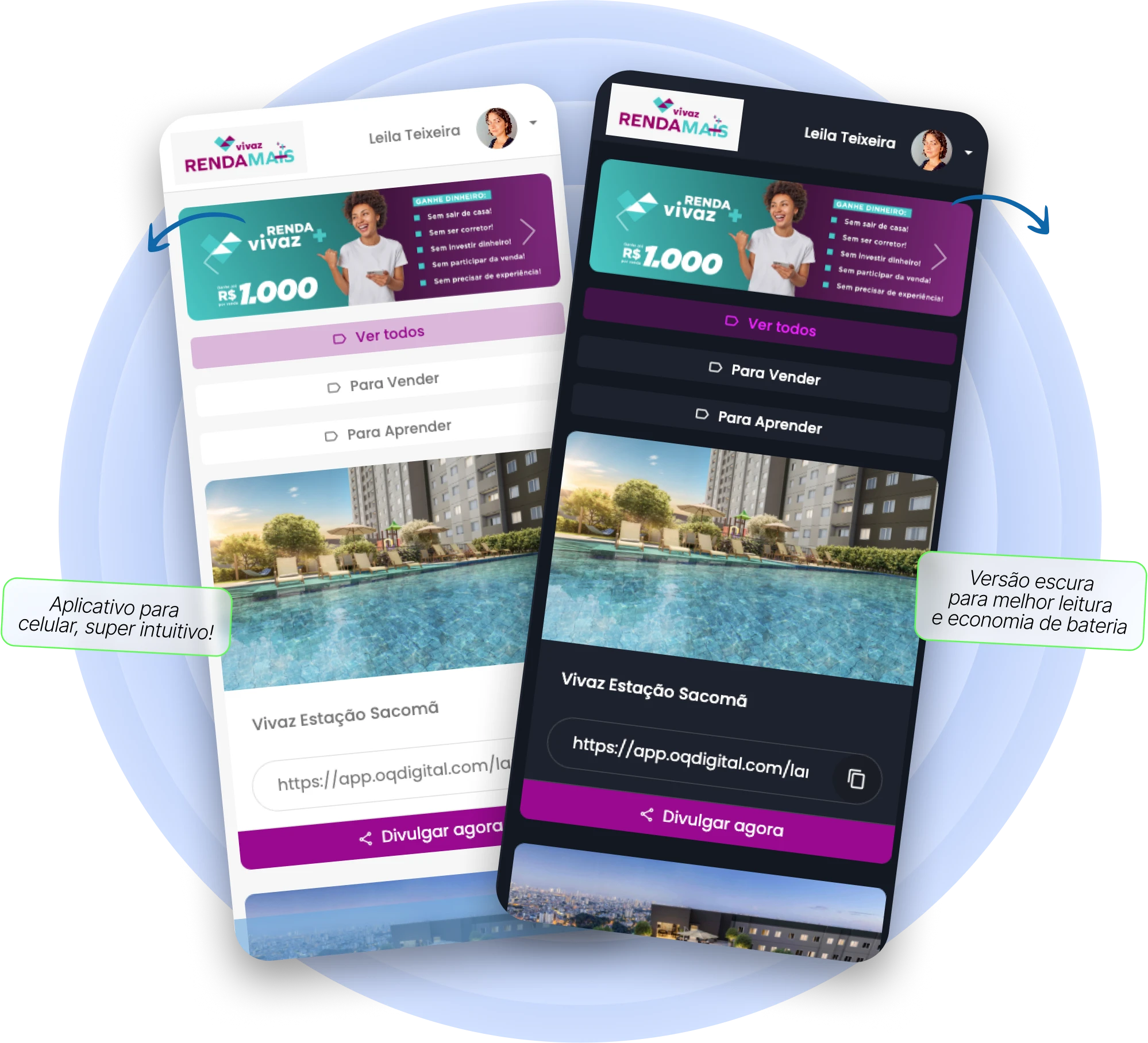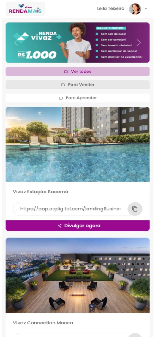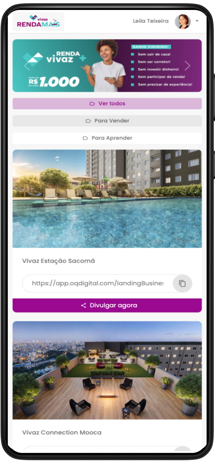 Com o OQ Indicar, todo usuário indicador ganha uma landing page personalizada de cada um dos seus empreendimentos para divulgar em suas redes sociais, WhatsApp, e-mail, etc.