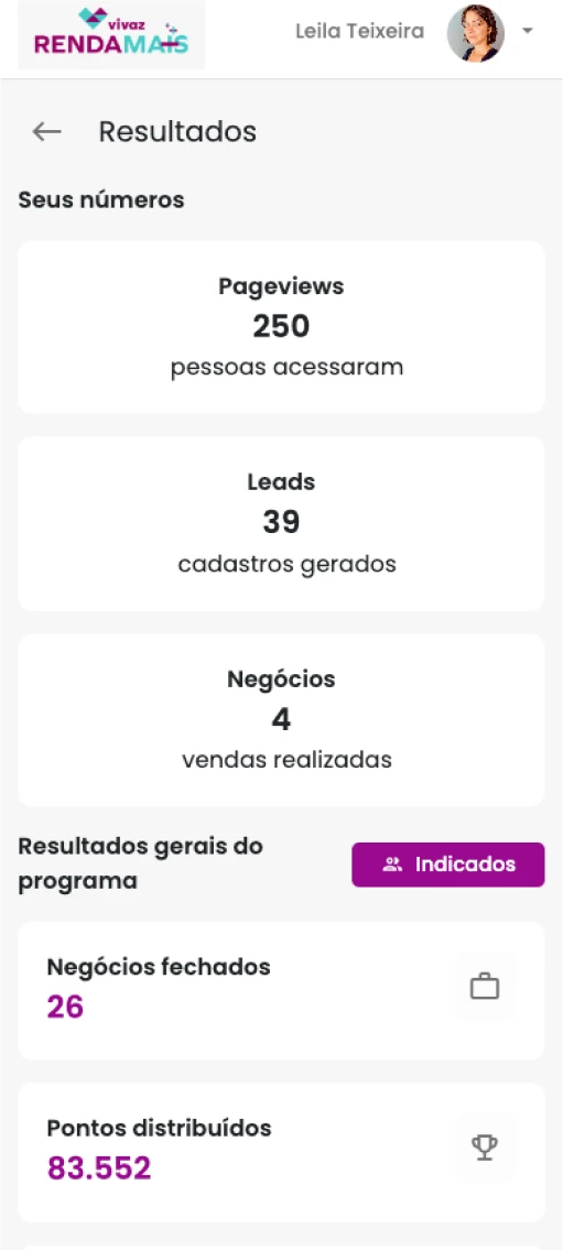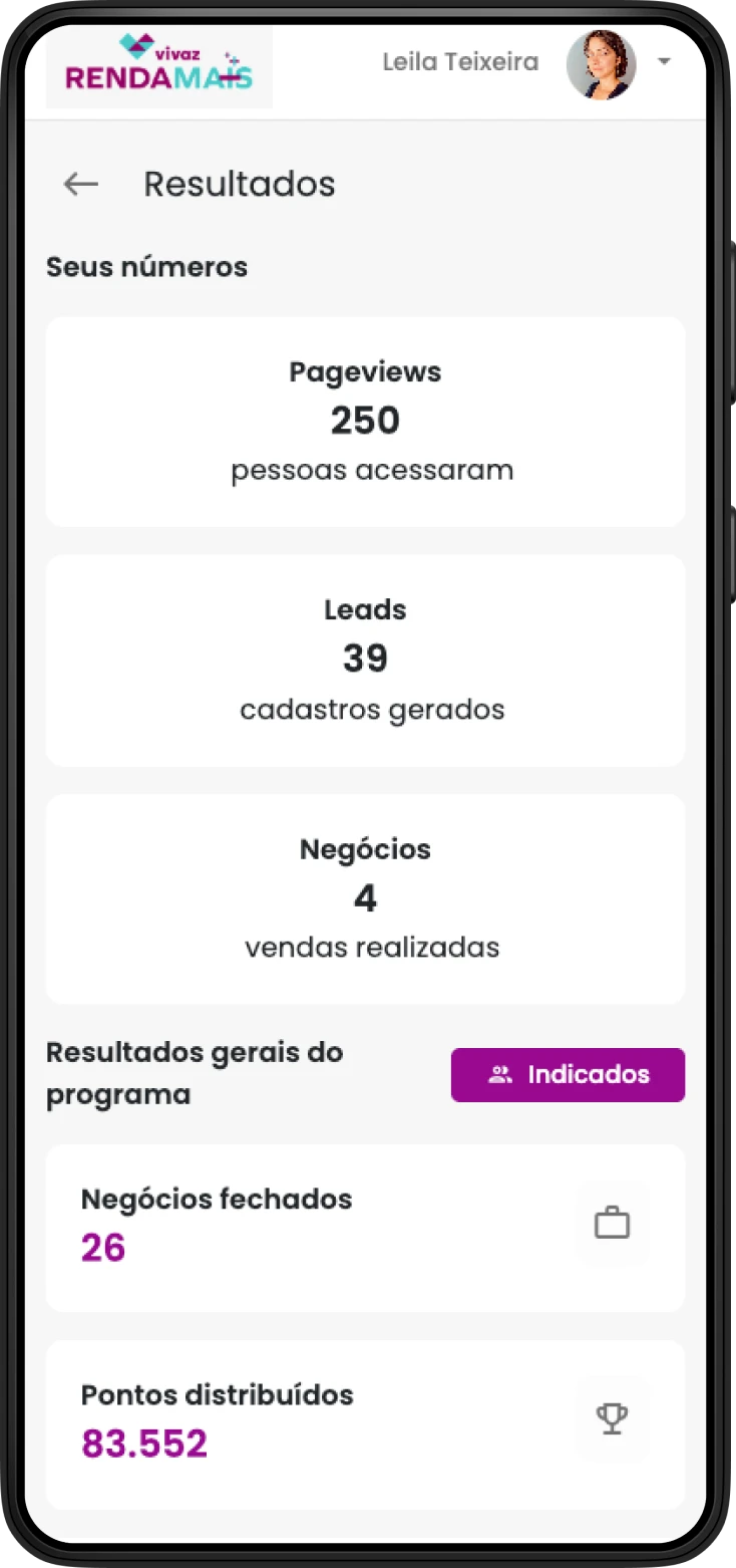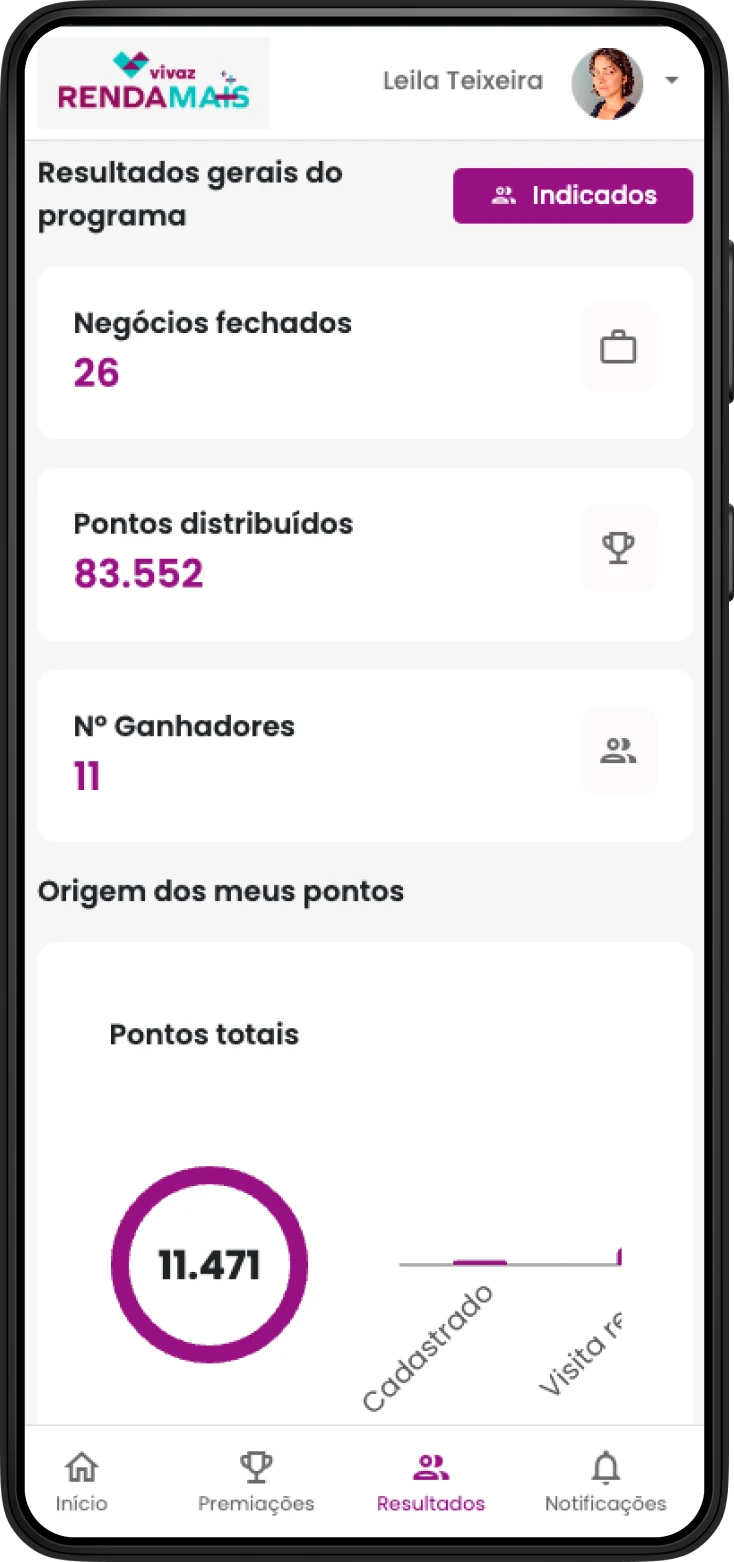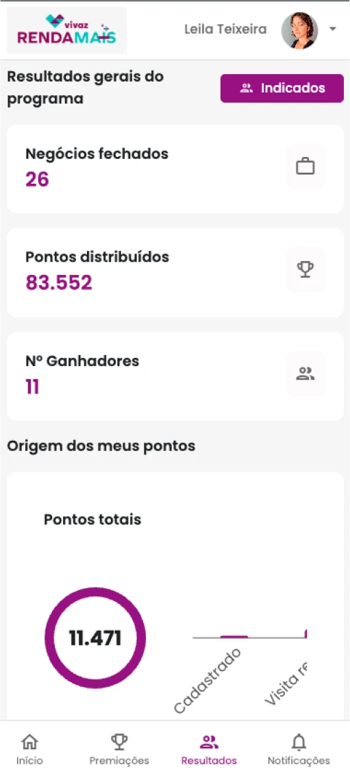 Dashboards individuais mostram a evolução pessoal do usuário, enquanto o histórico organiza indicações, pontos, prêmios e prazos sem complicação.