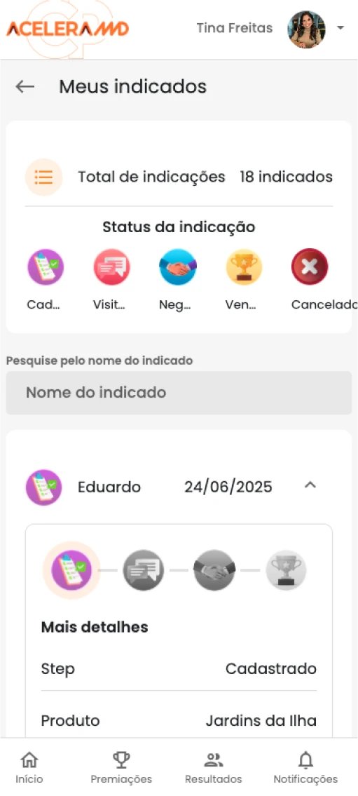 O usuário acompanha cada etapa da sua indicação no aplicativo.