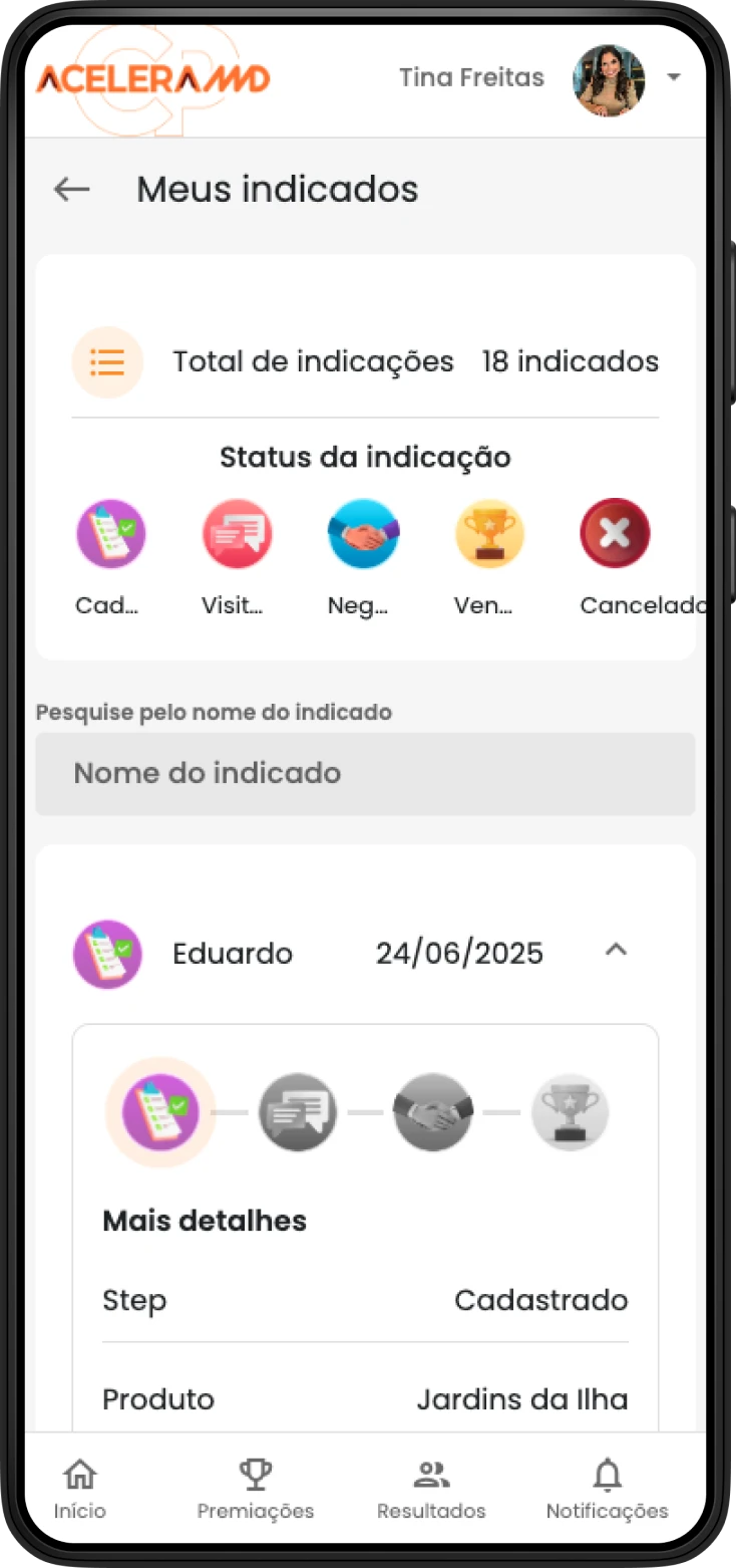 Essa visualização facilita o controle, dá clareza sobre o andamento das oportunidades e garante mais segurança e confiança no processo. Assim, o indicador sabe exatamente em qual fase da negociação sua indicação está e acompanha de perto até a conclusão da venda.