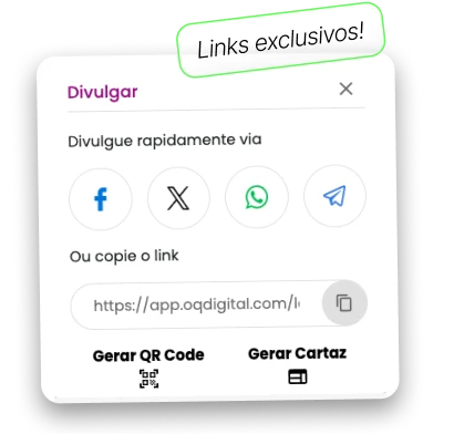 Cada participante recebe um link exclusivo de cada um dos seus empreendimentos para compartilhar no WhatsApp, redes sociais ou e-mail, já com uma LP completa, estruturada, pronta para ele divulgar e captar leads.
