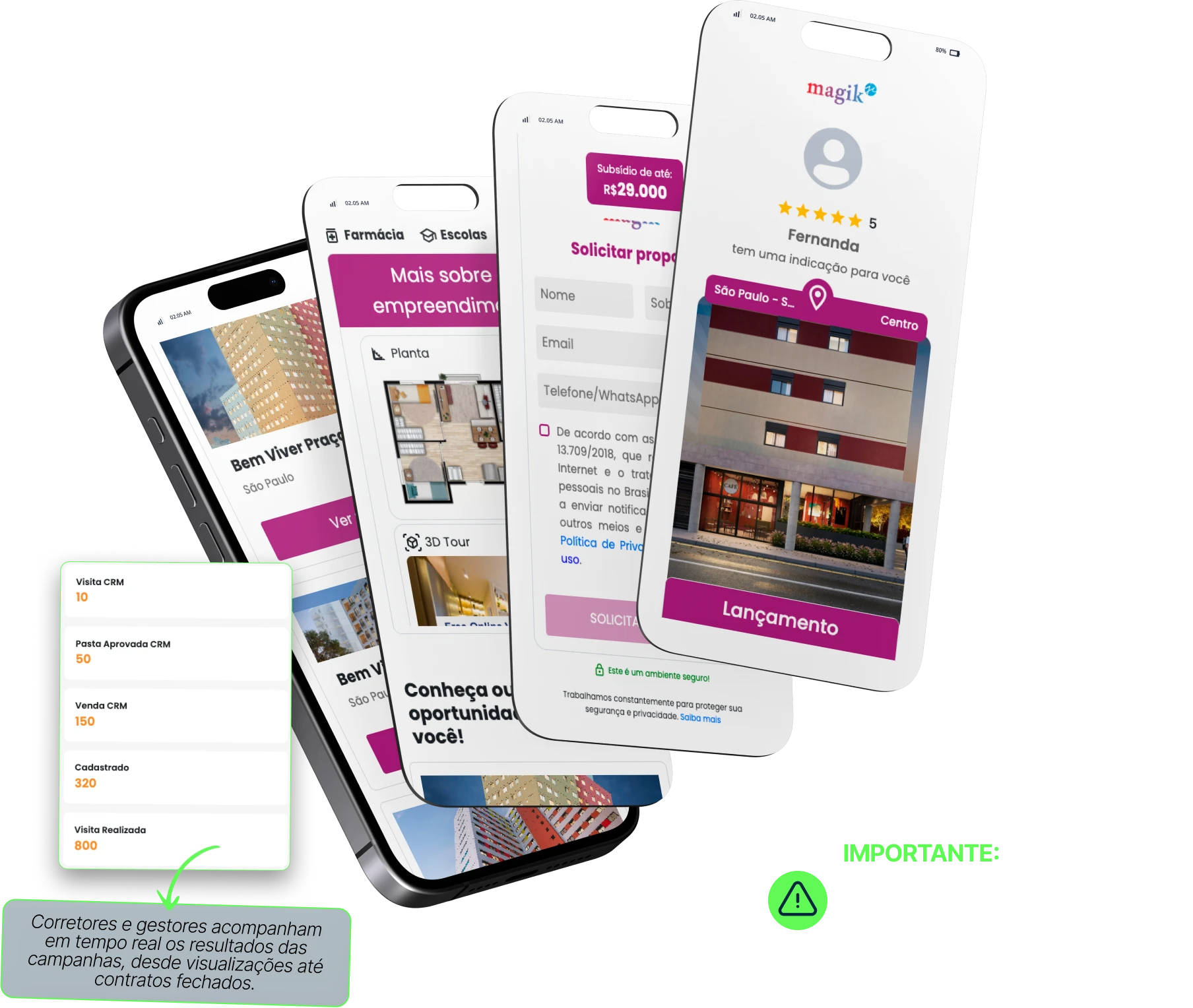 E não para por aí: dentro da plataforma, indicadores e gestores podem acompanhar em tempo real o desempenho de cada campanha — visualizações, leads gerados, contatos feitos, visitas realizadas e até contratos fechados.